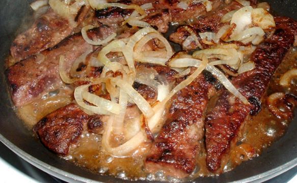 Slice the liver into 1/2 inch strips and shake in bag of seasonings to coat.