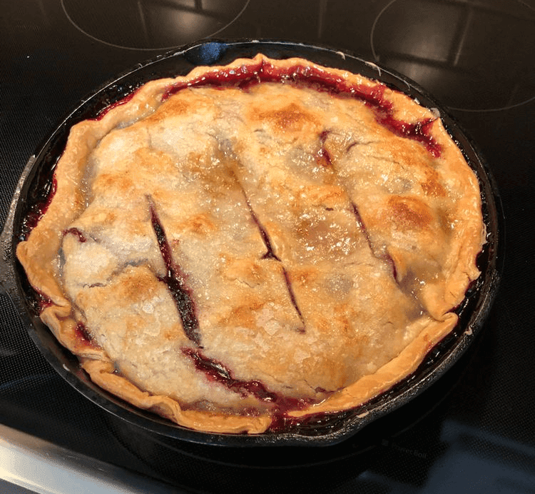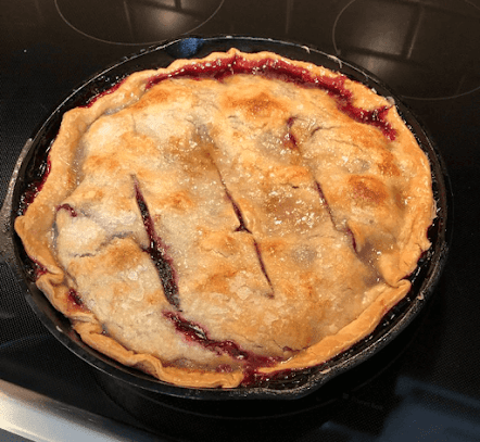 9.Unroll second pie crust over top of berries, sealing at the edges of the skillet.
