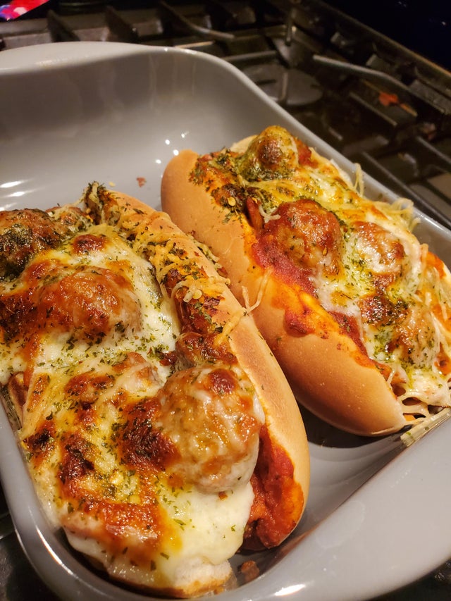 Arrange rolls in a 9×13 baking dish. Place 4 meatballs in each roll and top with a little bit of sauce and cheese.