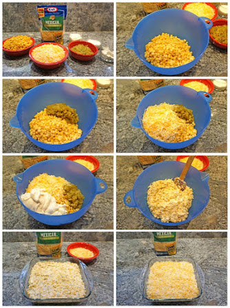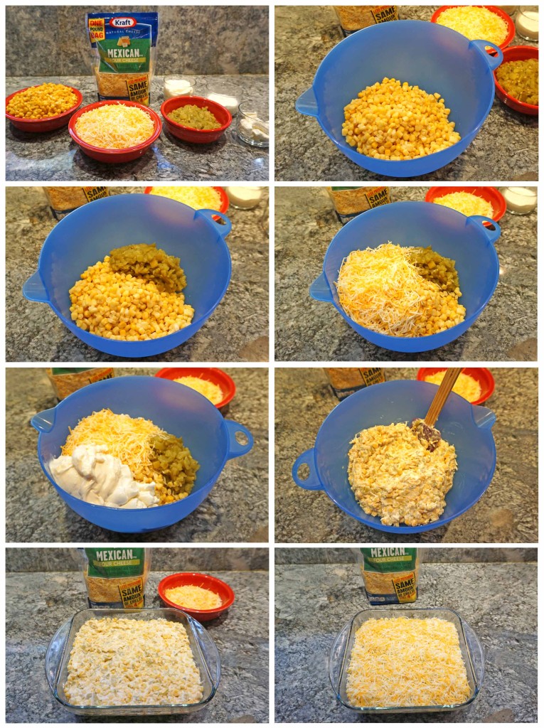 - Add corn, green chiles, 2 cups of the Kraft Natural Shredded Cheese – Mexican Four Cheese, mayonnaise, sour cream and cream cheese to a large mixing bowl.