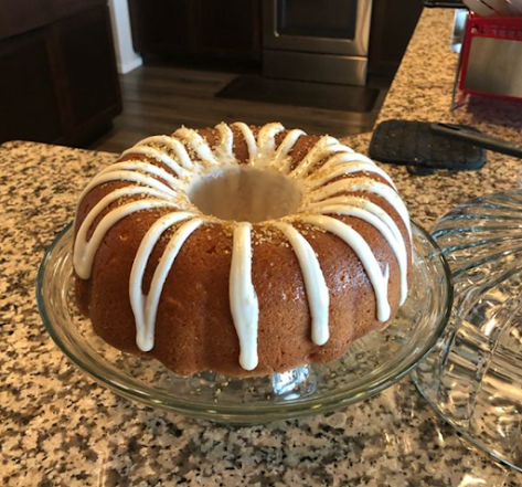 3. Bake for 70 to 80 minutes or until a knife inserted in the center of the cake comes out clean. Remove the cake from the oven and allow to cool for 5 minutes. Turn the cake over on a cake platter. Spread the lemon glaze over the warm cake so that the glaze can soak into the cake. Let the cake cool completely and drizzle the lemon cream cheese frosting over the cake.
