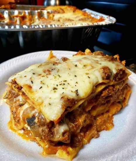 7. Place a layer of the boiled lasagna in an oven dish and spread half the ricotta cheese mixture and half the grated mozzarella cheese.