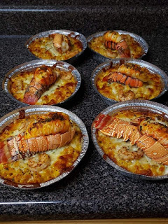 Meanwhile, preheat oven to 400°F. Pull lobster tails out of shells leaving the tab at the end intact, and lay the tail on top of the shell piggyback style. Drizzle each tail with a little olive oil and sprinkle with salt and pepper. Roast for 12-15 minutes until an instant-read thermometer registers 140-145°F. Let cool.